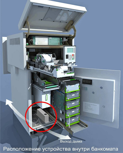 Патрон белого дыма может быть установлен как внутри корпуса устройства, так и вне его, внутри корпуса сервисной части банкомата, с обеспечением непосредственного выхода дыма за пределы корпуса банкомата.
