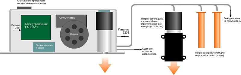 При открывании двери датчик подает сигнал на устройство и начинает отрабатывать алгоритм защиты. Аналогично начинается работа алгоритма в случае взлома двери или наклона банкомата. При этом подается звуковой сигнал. Через некоторое время срабатывает сирена, затем включается патрон белого дыма и подается сигнал на пульт охраны (при наличии такого подключения).