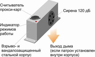 2.Дымовой патрон (картридж) белого дыма. Дым белого цвета заполняет пространство (до 60м³) рядом с банкоматом и дезориентирует злоумышленника. Состав дыма безопасен для человека и не оставляет следов на окружающих предметах. Дым хорошо заметен с больших расстояний и отлично привлекает внимание окружающих.